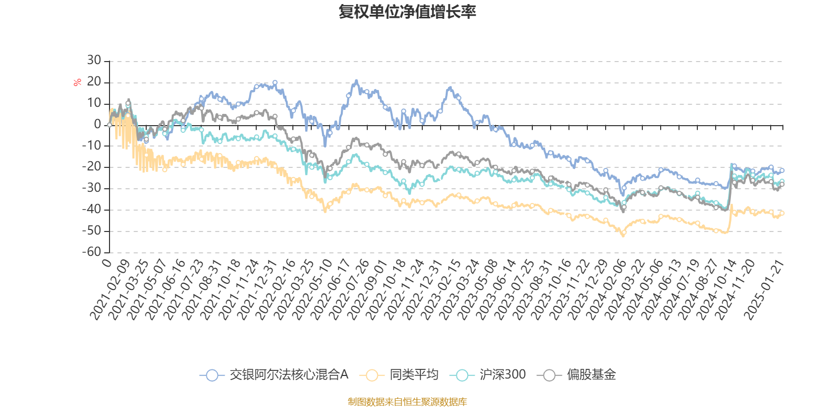 截至1月21日,交银阿尔法核心混合A近三个月复权单位净值增长率为-0.98%,位于同类可比基金68/135;近半年复权单位净值增长率为6.11%,位于同类可比基金84/135;近一年复权单位净值增长率为4.83%,位于同类可比基金122/135;近三年复权单位净值增长率为-30.04%,位于同类可比基金92/127。