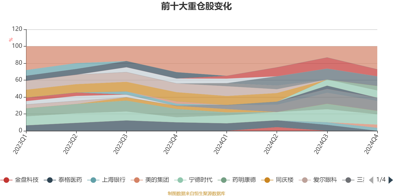 该基金持股集中度较高,近2年前十大重仓股集中度长期超过60%。截至2024年四季度末,基金十大重仓股分别是宁德时代、三星医疗、农业银行、中国银行、工商银行、江苏银行、药明康德、美的集团、海兴电力、上海银行。